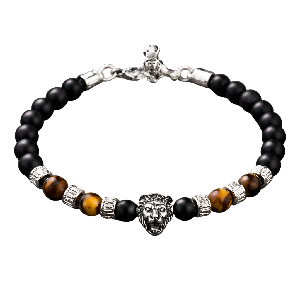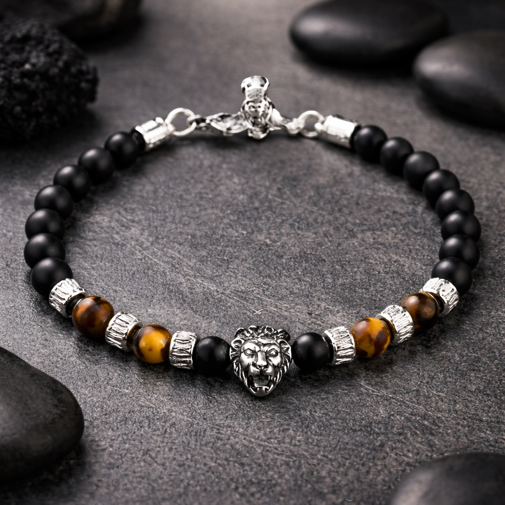Brățară bărbătească din mărgele negre, cu detaliu central în formă de leu, simbol al forței, curajului și autorității. Un accesoriu elegant, creat pentru bărbații care conduc prin atitudine.